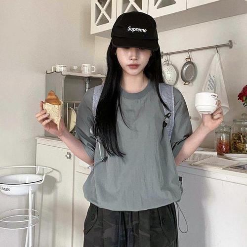 |CMT9573|여성용 반팔 후드 바람막이 티셔츠 더블 스트링 디자인