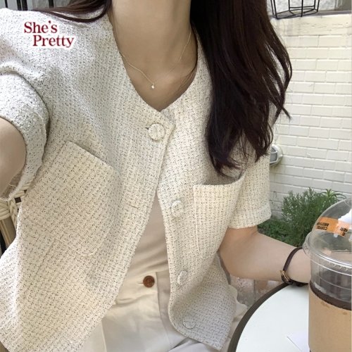 [미라클세븐]여성 반팔 트위드 자켓 노카라 진주 버튼 오피스 스타일