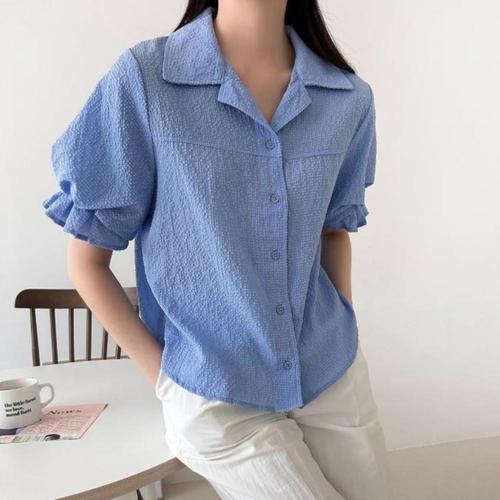 |CDH3E8B|여성용 엠보싱 패턴 반팔 퍼프 카라 블라우스