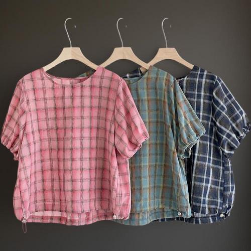 |KSH3EBD|여성 체크 패턴 퍼프 소매 오버핏 라운드넥 반팔 블라우스
