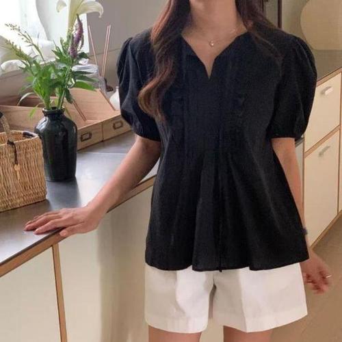 [신상오픈런]|CSH3378|여자 브이넥 카라넥 퍼프 소매 반팔 블라우스_18159927_597559