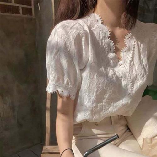 레이스 브이넥 퍼프소매 블라우스 여리핏 데일리 반팔탑