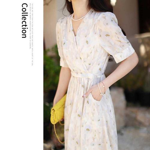 KDNC 플라워 브이넥원피스 여름 쉬폰원피스 조임 롱스커트 여성 반팔원피스