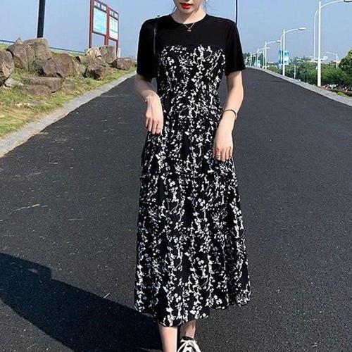 [셀럽하우스]플라워 WQDJ1468 여성 캐주얼 반팔 롱원피스 1P A라인 하이 웨