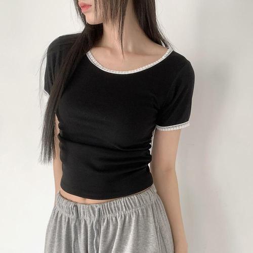 [1+1] [옷자락] 여자 파스텔 레이스 라운드넥 옆셔링 크롭반팔 티셔츠