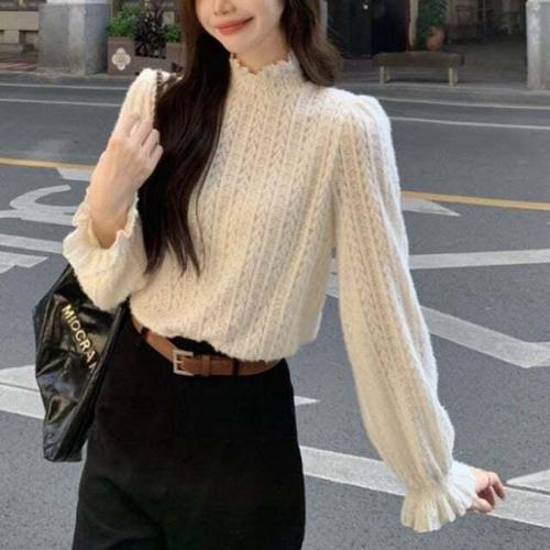 TKX 여성 포근한 겨울용 반 하이넥 프릴 장식 블라우스 귀여운 하트 자수 슬림핏 KZ35