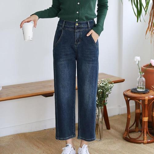 오스틱니 [날씬해보이는] 105kg까지 여성 겨울 빅사이즈 밴딩 롤업 밑단 수술 와이드 9부 청바지 봄 여름 통바지 슬렉스 진 연 블루 큰옷 여성의류 여자 데일리 캐주얼 데님 팬츠