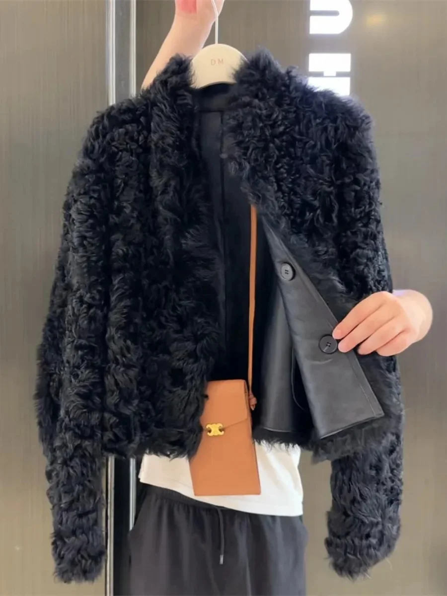 시크한 두꺼운 PU 가죽 스플라이스 블랙 양털 재킷 여성용 가을 겨울 한국 스타일 스몰 사이즈 패셔너블 탑