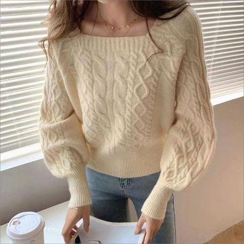 [셀러허브_여성트랜드패션]Rly 여성 스퀘어넥 벌룬소매 케이블 꽈배기 니트 스웨