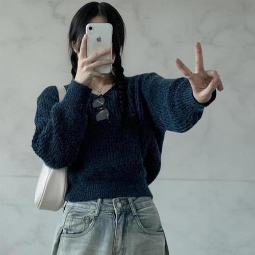 [옷자락] 여성 넥라인포인트 벌룬 소매 라운드넥 가을 니트