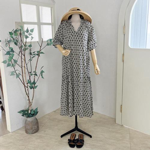 [VY] 여성 SS 패턴 휴가룩 V넥 벌룬 면원단 롱원피스
