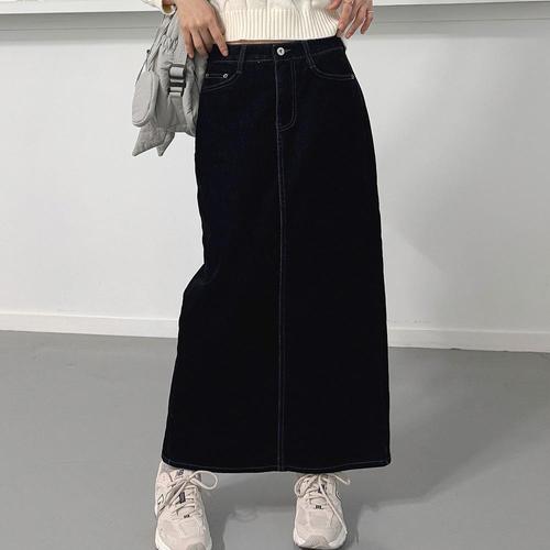여자 진 자수 H라인 검정 벨벳치마 롱스커트