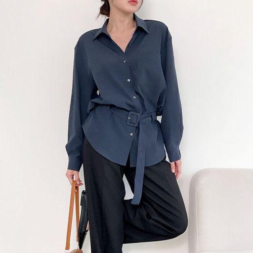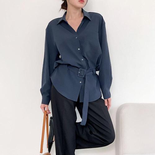 [패션시그널]벨트디테일 솔리드 라운드넥 블라우스 437F4F
