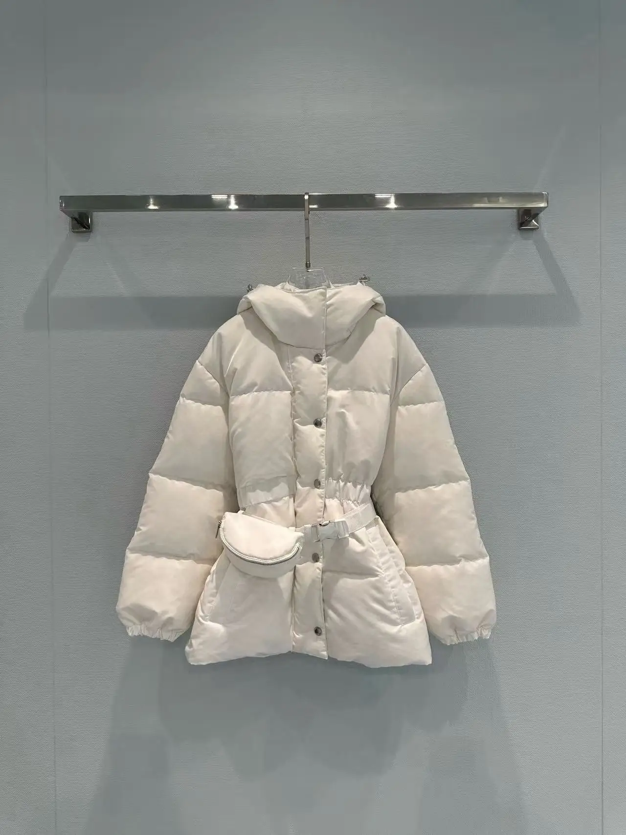 우아한 삼각형 로고 장식 벨트 후드 다운 재킷 겨울 두꺼운 출퇴근 스타일 화이트 덕 페더 여성 코트