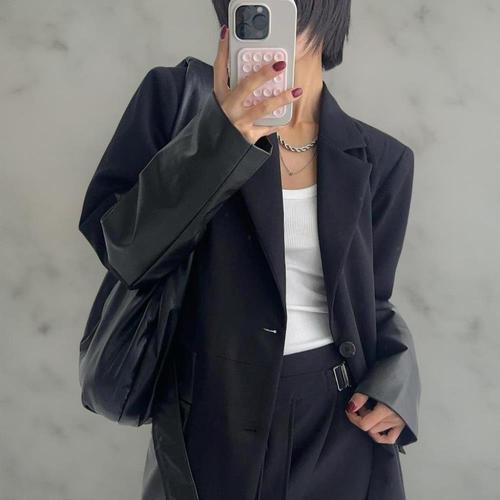 [옷자락]여성 가을 세련된 배색 가죽 하프 자켓 벨트 포함