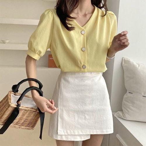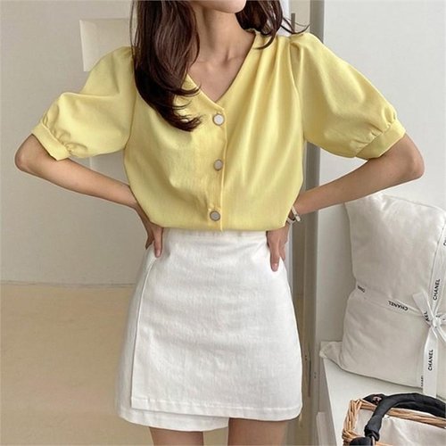 [다잇템]여자 V넥 연보라 단추 빅 벌룬소매 블라우스