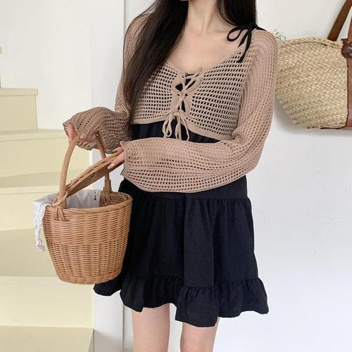 펀치 니트 스트링 가디건 리본포인트 긴팔 여성 여름 여름용 얇은 카디건 숏가디건 로브 망사 그물 숄가디