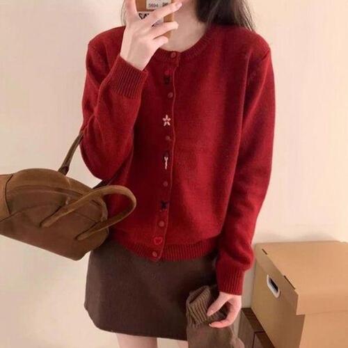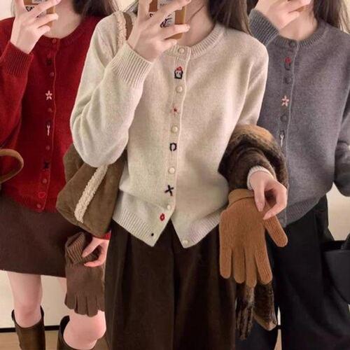 여성 라운드 넥 봄 가을 꽃 자수 니트 가디건 레드