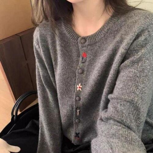 [끌레아]여성 라운드 넥 봄 가을 꽃 자수 니트 가디건 그레이 여자 봄가디건 꽃자수 꽃가디건