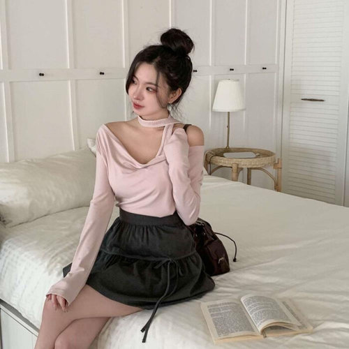 [옷자락]여자 봄신상 간절기 편안한 홀터 오프숄더 드레이프 셔링 티셔츠