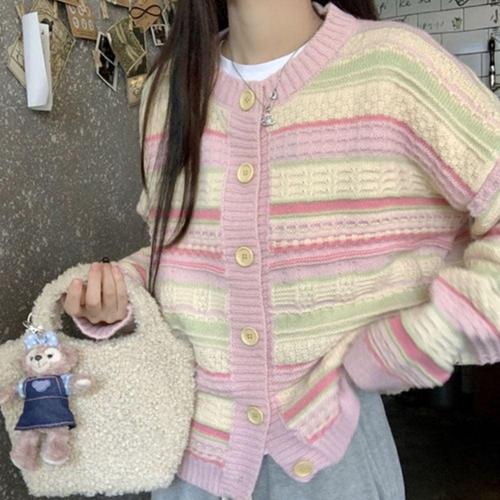 파스텔 컬러 스트라이프 배색 긴팔 봄 가을 니트 가디건 WFLX6H8