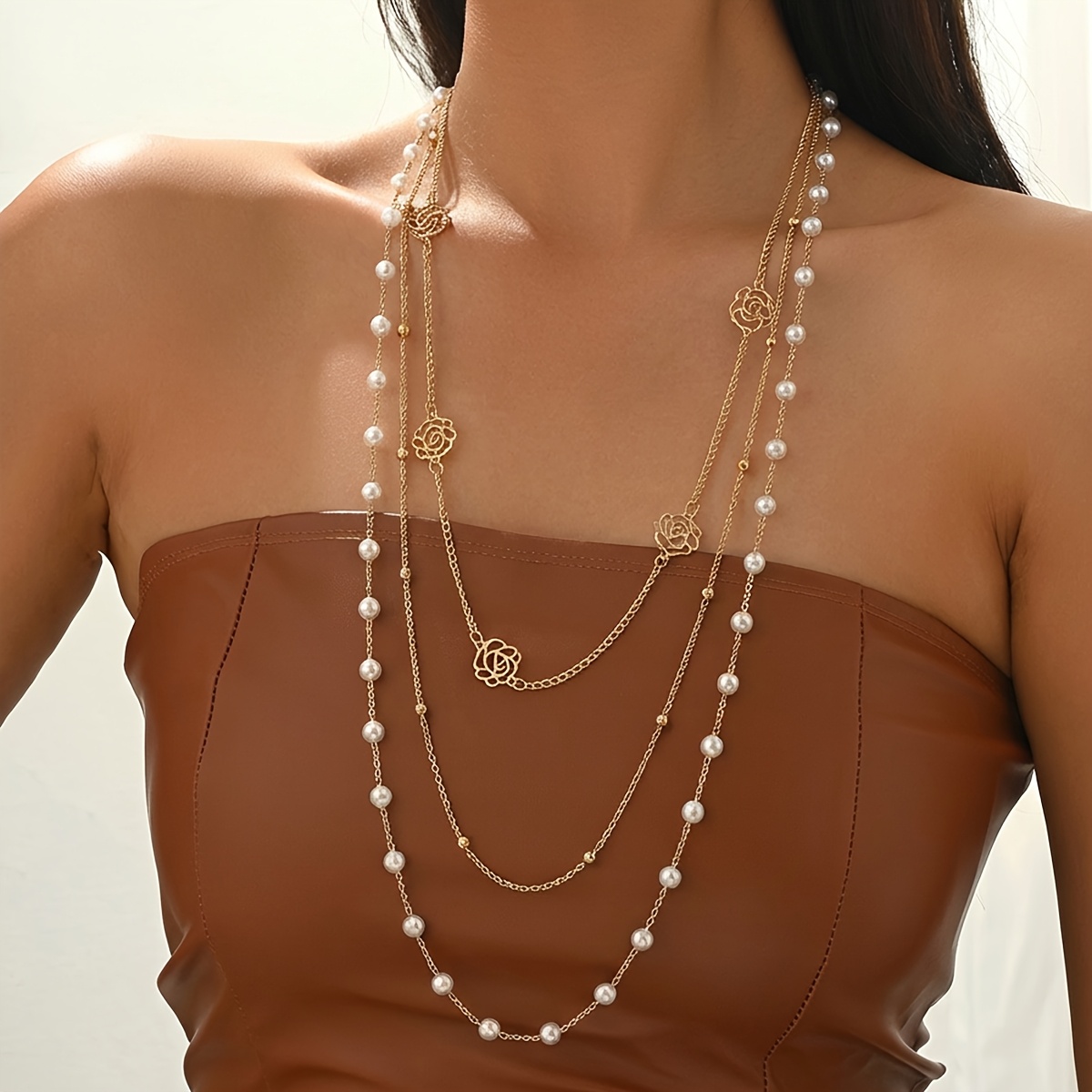 TEMU LXALRY의 1개 긴 플로럴 멀티 레이어 인조 진주 목걸이 | 스타일과 우아함, 데일리 및 휴가 행사에 적합, 철 및 플라스틱 재질