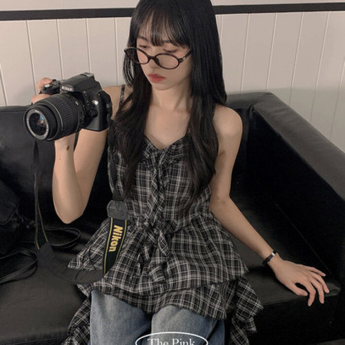 더핑크 / 하므 체크 언발 러플 끈 뷔스티에 블라우스