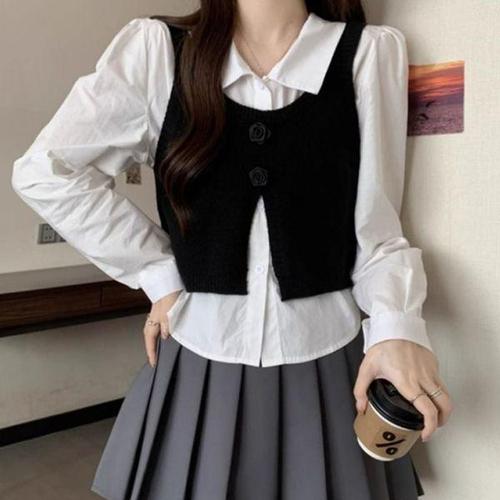 [스타일링완성] 셔츠와 상의가 하나로 레이어드 뷔스티에 셔츠 일체형 블라우스