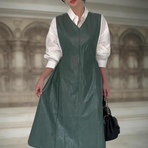 옷자락 / 여성 옆버클 브이넥 민소매 A라인 가죽 롱드레스