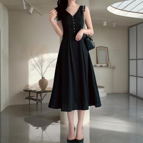 [다잇템]여성 슬리브리스 검정 V넥 베이직 롱 원피스 (42078053A)