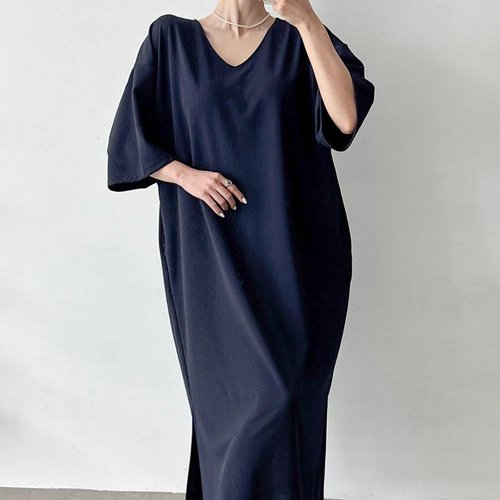 [셀러허브_여성트랜드패션]ONM 브이넥 포켓 반팔 롱 원피스 여성 데일리 빅사이