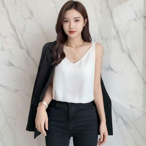 [신상오픈런]여성 루즈핏 실크 브이넥 민소매 슬리브리스 탑