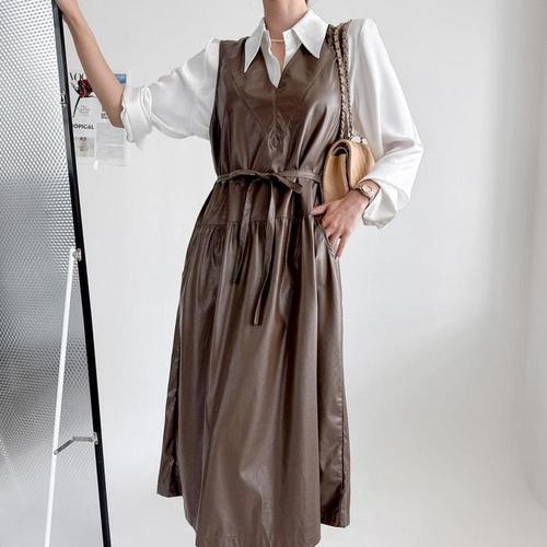 KAA 9006W 쉬폰 V넥 벨트 나시 롱 원피스