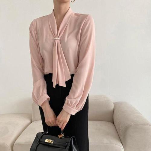 [다잇템]여자 롱슬리브 V넥 진주 보우 무지 블라우스