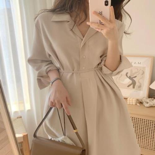 [무슈봉]봄 브이넥 셔츠 오피스룩 루즈핏 맥시 하객 롱 원피스