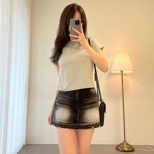 [옷자락]여자 Y2K 컷팅 구제 워싱 블랙데님 장마룩 미니스커트