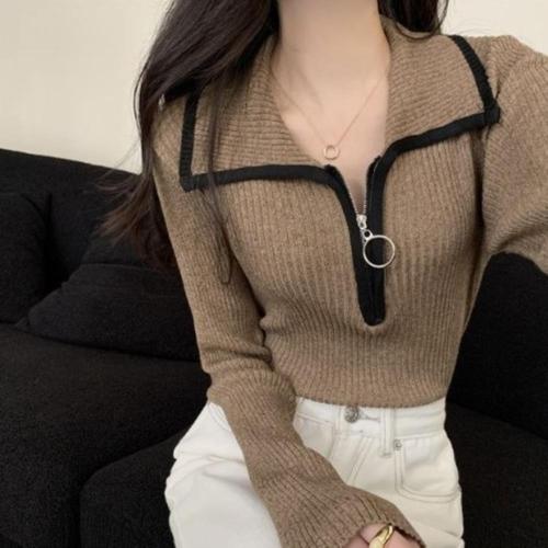 [미라클세븐]여성 카라 라인 블랙 포인트 반지퍼 골지 니트