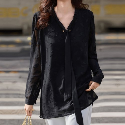 [리빌모아]여자 시스루 긴팔 롤업 크롭 블라우스 셔츠 DJW-SHS-SKQQ77146-블랙