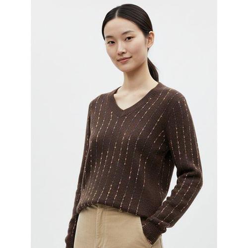 [샵앤]여성 V넥 블링 스트라이프 스티치 긴팔 니트 티셔츠 RBE-WKN-20872-브라운