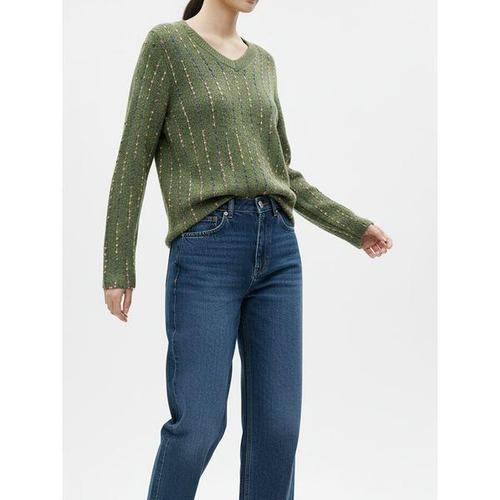 [샵앤]여성 V넥 블링 스트라이프 스티치 긴팔 니트 티셔츠 RBE-WKN-20872-카키