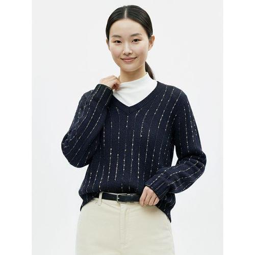 [샵앤]여성 V넥 블링 스트라이프 스티치 긴팔 니트 티셔츠 RBE-WKN-20872-네이비