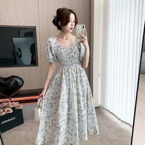 [옷자락] 여성 봄여름 캐주얼 플로럴 퍼프 미디 원피스