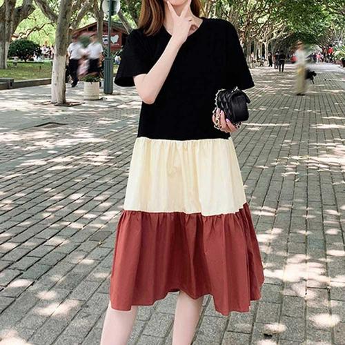 배색 미디 원피스 A라인 여자 반팔 데일리 캐주얼룩 WC79C0B