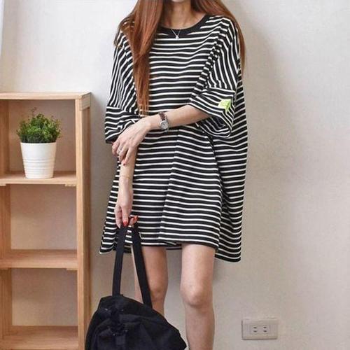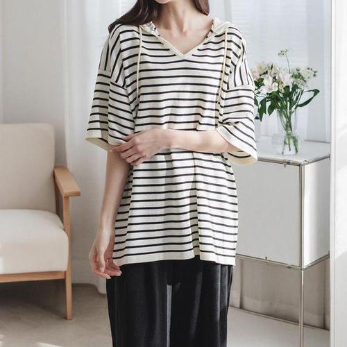 [다잇템]여자 반소매 캐쥬얼 줄무늬 빅사이즈 후디 니트