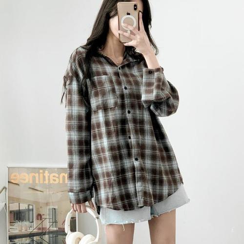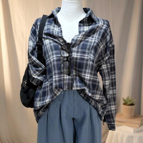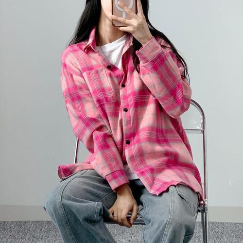 [다잇템]여성 격자 빅사이즈 롱슬리브 캐쥬얼 셔츠