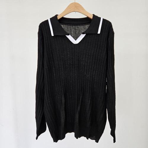 빅사이즈 여성 가을 겨울 고급스러운 두툼 배색 브이넥 긴팔 스웨터 니트티 상의
