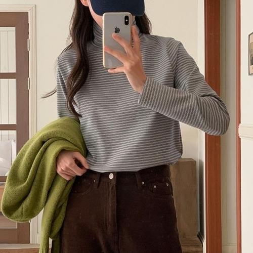 [다잇템][다잇템] 여자 빅사이즈 트임 줄무늬 폴라넥 단가라 터틀넥 티셔츠_24000005_588872