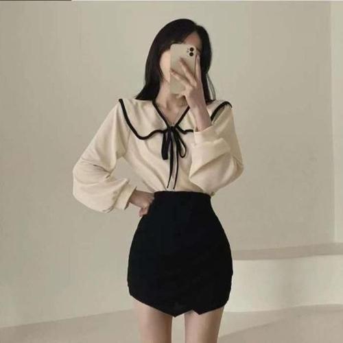 [옷자락]여성 가을 의상 언발란스 빅카라 퍼프 뒷리본 하객용 블라우스