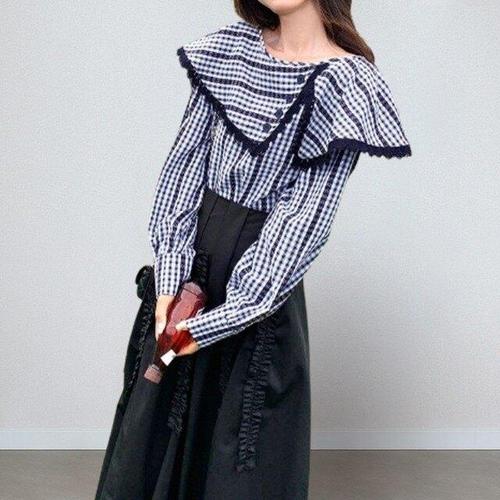 아이엠몽 여성 체크 빅카라 퍼프 루즈 셔츠