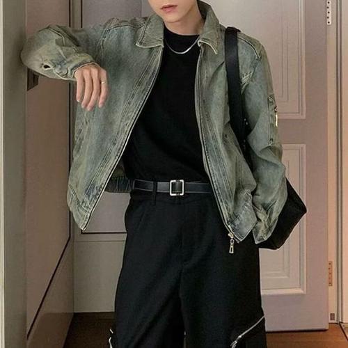 AOKADA 남성 아메리칸 빈티지 유니크 슬림핏 스탠드칼라 지퍼 워크웨어 바이크라이딩 데님자켓